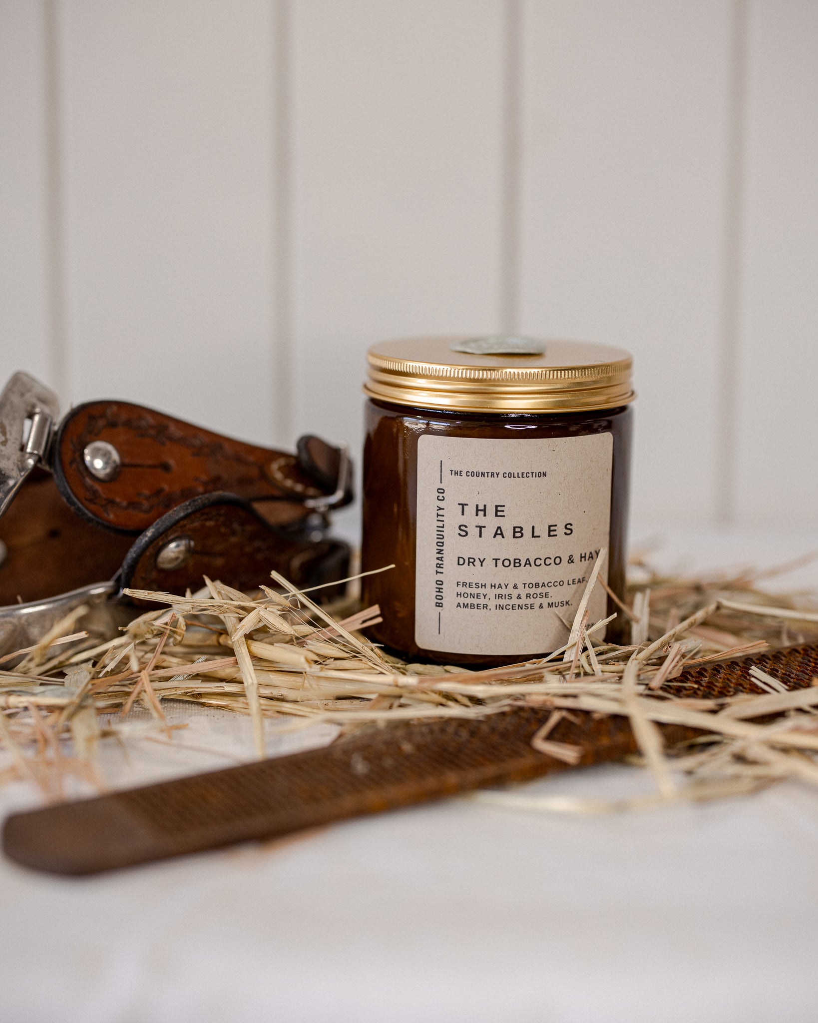 Step inside The Stables, where the scent of fresh hay mingles with aged tobacco and soft golden light spills across worn timber beams. This captivating fragrance embodies the quiet strength and grounded warmth of country living.